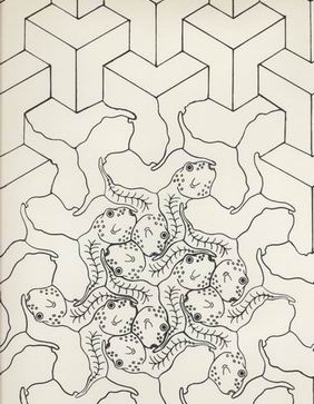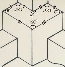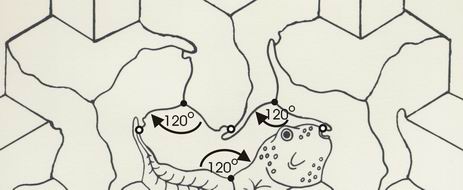 To see why the resulting figure tessellates, imagine rotating the shape about any of its 120 degree vertices. Since 3 times 120 degrees equals 360 degrees, exactly three such shapes will fill up all the space around any such vertex. Now how about the other three vertices? You will see that the total angle around each of the non-120 degree vertices is equal to A+B+C. But the internal angles of any hexagon sum to 720 degrees, and since we have already used up 360 degrees with the three 120 degree angles, A+B+C must also equal 360 degrees. Hence the space is filled at the other three vertices. Once you have a tessellating hexagon, you can replace the straight lines with curves that are duplicated and rotated 120 degrees. This formula forms the basis of the SHMUZZLE (tm) Puzzle as well as From Polygons to Pollywogs, a silkscreen I did in the early 1980’s. |